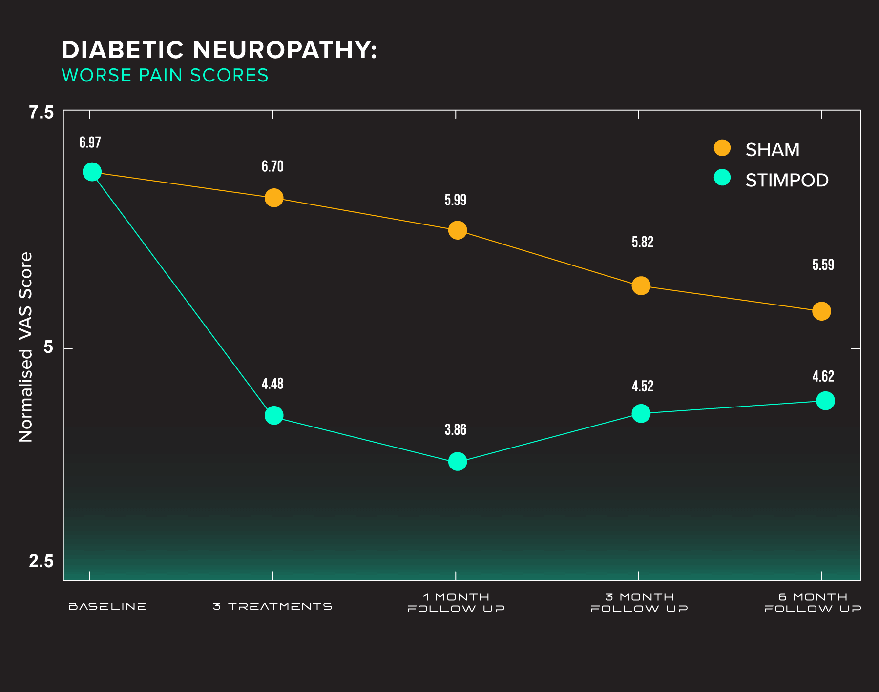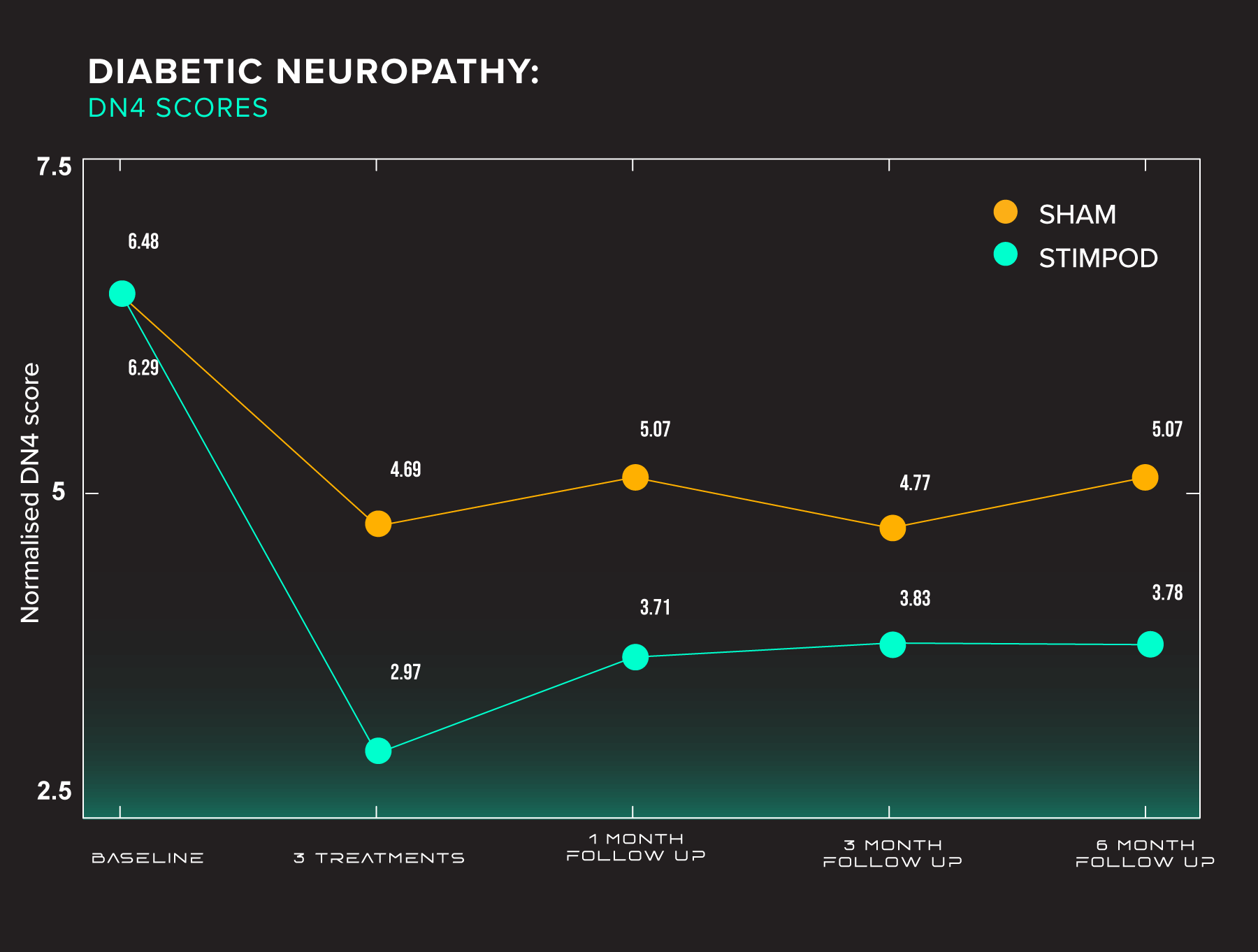 Method: Patients were selected by their physicians at Centres for Diabetes and randomised into 2 groups – 40 patients each in the groups (A=Active, B =Placebo). Inclusion criteria were pedal Diabetic Peripheral Neuropathy and having a score of 4 or 4+/10 in the DN4 Test. Exclusion criteria: previous experience with the pulsed radiofrequency current and having: peripheral or spinal cord stimulator, pacemaker, metal implants and pregnancy. The DN4 was the primary objective and BPI-SF (secondary) was also tested at baseline, after 3 treatments and 3 follow-ups at 1, 3 and 6 months. Each patient had 3 treatments or a placebo once weekly for 10 mins bilaterally at the sciatic nerve in the popliteal fossa.